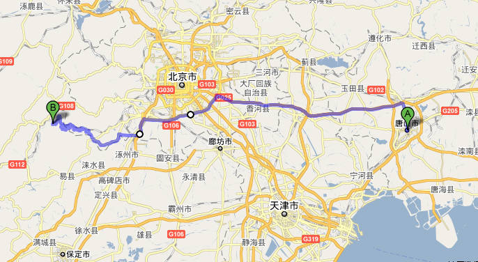 河北省唐山市----上112國道----G1京哈高速----東六環出口----走東六環----南六環----京石高速----前往G4京港澳高速----琉璃河下高速----琉陶路----上岳琉路----上岳李路----房易路----在長溝中學路口向右轉----進入云居寺路----周張路----在張坊北口稍微向右轉----十渡路口左轉前行上十大路----野三坡大街......金三角稍向左轉----直行9公里----見交警培訓中心(三層賓館)----順路直行300米----別拐彎----路左側楊樹林內-----就是百里峽站長農家院