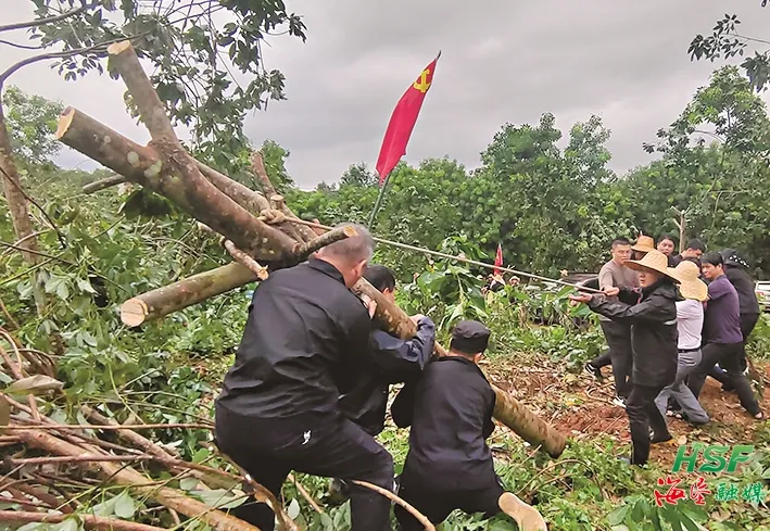 9月7日一大早,儋州市蘭洋鎮,海南農墾旅游集團有限公司和海南橡膠西聯分公司組織黨員干部在路面上,移走倒伏的大樹,清理斷枝殘葉。