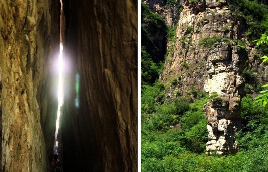 從十渡孤山寨大門向里溜達,便進入了人們常說的千古河床。所謂千古河床,是指孤山寨峽谷的久遠。河水并不大,河面并不寬,河床卻極有特色。整個河床河床似用一塊平滑的巨石鋪就,細看那斑斕絢麗的圖案竟是由許多不同質料不同顏色的石塊組成,彼此吞含,相擁相容無絲毫縫隙,疑是人工弄巧,確是天然形成。這就是孤山寨著名的奇觀石中石。在十渡旅游沿千古河床北麓登階而上,路過坦克石、奶奶廟、山寨古墻,前走不遠處是望孤亭,不用手搭涼棚便可看到小孤山。然而看一線天還需要繼續前行幾百米,可見一幾乎直立的陡峭山坡,轉過一條溝走到近前,猛一抬頭,忽見兩山峰之間裂開一條巨大的縫隙,這道裂縫長約百米,高有數丈,寬剛好容下一身。這就是一線天。邁進洞去,頓覺涼風颼颼,兩壁山巖造型奇特,摸索行進間仰望穹窿,隱約中看一線藍天,如銀蛇游海,不得不讓人嘆服大自然造化之神奇。