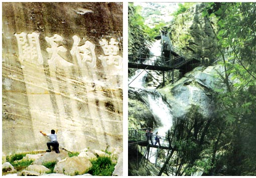 在野三坡拓展,龍門天關景區(qū)文化長廊:龍門天關是歷史上京都通往塞外的重要關隘,是歷代兵家必爭之地,明清代均有重兵把守,因而留下了大量人文建筑和摩崖石刻,大龍門城堡、內長城、二圣祠、大龍門古村、猿人谷、上天溝、龍門峽谷、被舉譽為華北最大的歷史文化長廊。 立兒石:此石位于龍門峽中部,在公路左側,石面有一長方石孔,相傳王母屢生閨秀,難得一兒,故祈求如來(如來佛像石刻在立兒石上方50米處)傳授生兒之道。答曰欲生男兒須執(zhí)三塊石子,去立兒石試之,如三塊石子全部投中,即兒女滿堂;有兩塊落入,只生男兒;若有一塊投中只生女兒;如無一投中即為絕戶之命。王母領命而行,結果投中一塊,便掃興而去,立于望兒嶺上,仰天感嘆不已,曰:吾求不得,只得寄予女兒身上。傳為笑柄。 摩崖石刻:在峽谷一側的石壁上,留下歷代關將士的20余處石刻。有的描寫山河壯美,有的寫地勢險要,主要有;萬仞天關;峰環(huán)萬疊、;險勝重圍;龍行虎踞,玉壁金湯;疆域咽喉、天成形勝等。抒發(fā)了將士的愛國之情。最大的一處是萬仞天關,字高2.15米,氣勢雄。這些石刻運筆自如,筆力遒勁,是難得的書法珍品,許多文人墨客游覽后,都形象的稱龍門峽為;文化長廊。 |