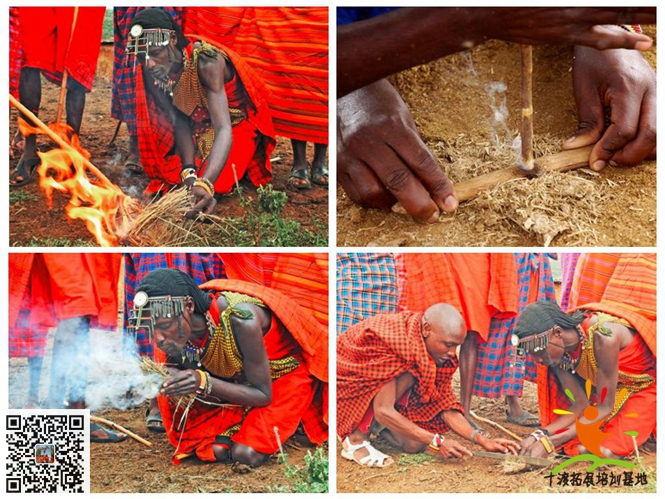 利用簡單的工具,在教練的指導下,鉆木取火。