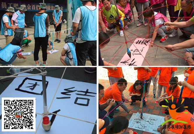 游戲規則 在地上放一張一平米大的紙。所有隊員拉繩子的末端,不得接觸毛筆,按照教練的要求完成指定的任務。最快完成的為獲勝。教練也可以根據字的美觀度來打分。